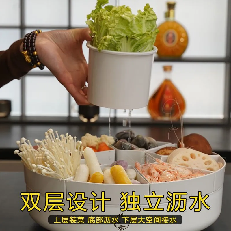 创意分格旋转火锅蔬菜拼盘双层家用沥水盆,以其独特的创意设计、实用的功能以及时尚的外观,成为厨房中不可或缺的得力助手。无论是准备火锅盛宴,还是日常备菜,它都能大显身手,为烹饪生活带来更多的便捷与乐趣。让我们将这款时尚的多功能备菜盆纳入厨房,开启美好的烹饪之旅。