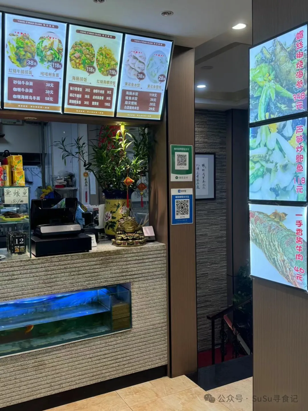 店铺里面不大,但是布置得很清爽,干干净净根本不像那种街头面馆。店内裱起来的这个相框看得出餐厅主厨有着丰富的烹饪经验。餐厅有三层,地下一层,一层和二层,包间在负一层。今天我们就两个人,在大厅的角落便坐下来了,因为方便看到停在路边的车,这年头餐厅没有停车位真是最大的弊端。