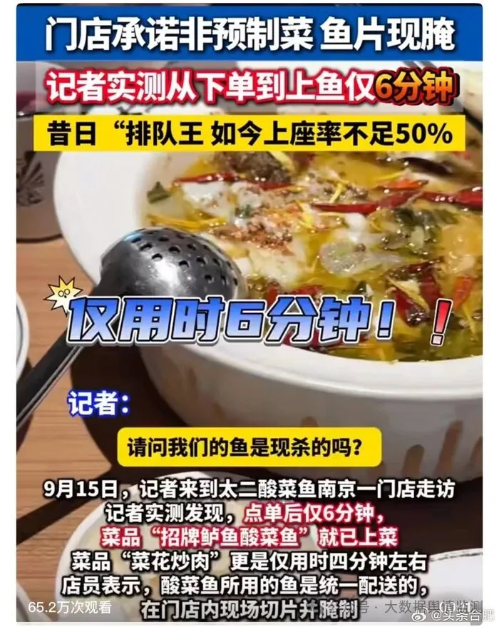预制菜争议:成为行业核心议题,西贝“高价预制菜”事件引发8亿次阅读,太二酸菜鱼“6分钟上菜”质疑导致43小时内4.2万条信息爆发。