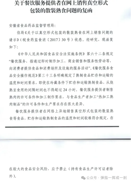 2017年,国家食药局在复函中明确要求餐饮服务经营者网络销售自制熟食应予禁止,但如何禁止并未做出说明。从实际执法情况看,多数观点支持无证生产行为的定性和处罚。在此,我说说个人看法。