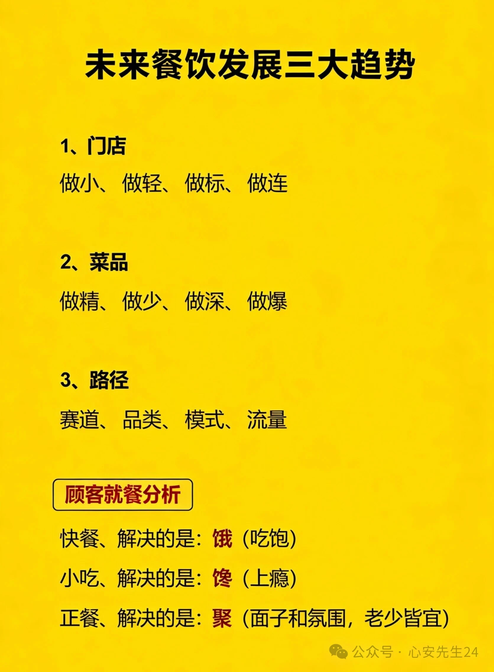 此外,餐饮消费需匹配用户“饿、馋、聚”三大需求:快餐主打效率与性价比,解决“吃饱”刚需;小吃强化口味成瘾性,满足“解馋”情绪;正餐营造氛围体验,承接“社交”场景,不同品类需精准匹配需求才能持续盈利。