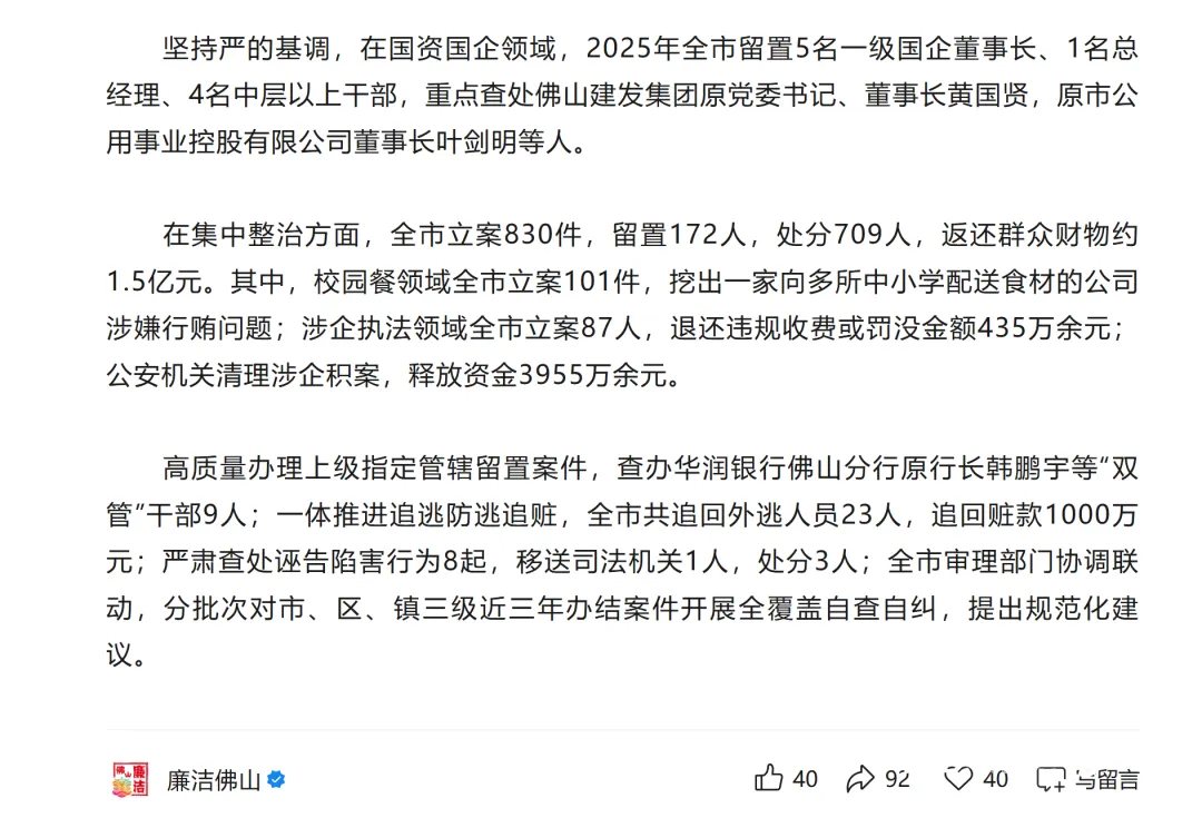 佛山市纪委监委披露,在国资国企领域,2025年,全市留置5名一级国企董事长、1名总经理、4名中层以上干部,重点查处佛山建发集团原党委书记、董事长黄国贤,原市公用事业控股有限公司董事长叶剑明等人。