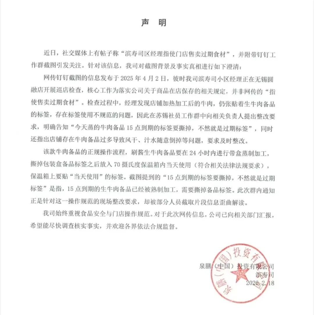 滨寿司在2月18日,也就是大年初一,紧急发布声明,对截图背景和事实真相进行澄清。首先滨寿司确认了截图的真实性,并且指出,截图信息发布并非近日,而是在2025年4月2日。并且说明了事发背景:滨寿司小区经理正在无锡圆融店开展巡店检查,核心工作为落实公司关于商品在店保存的相关规定,并非网传的“指使售卖过期食材”。