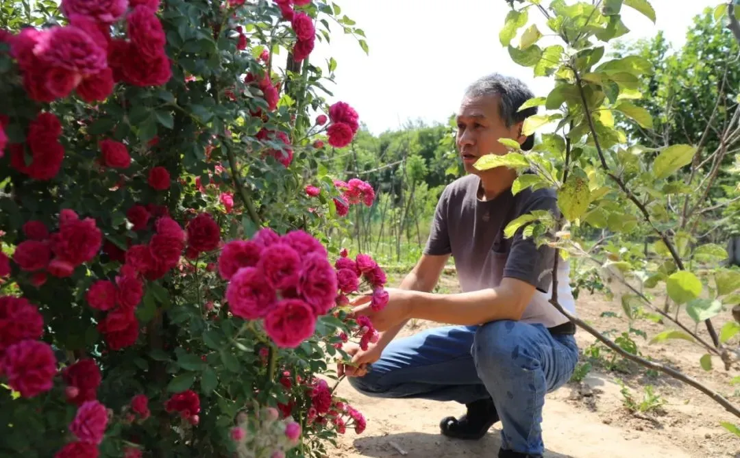 在租种的六分田地里,他种上了茄子、豆角、韭菜、花生、山楂等农作物,多达二十余种。为了管理方便,他还围上了篱笆,埋下了水管,立起了喷灌,并在菜园里搭建了一个由玫瑰、牡丹环绕的凉棚,俨然一幅优美的田园画卷。