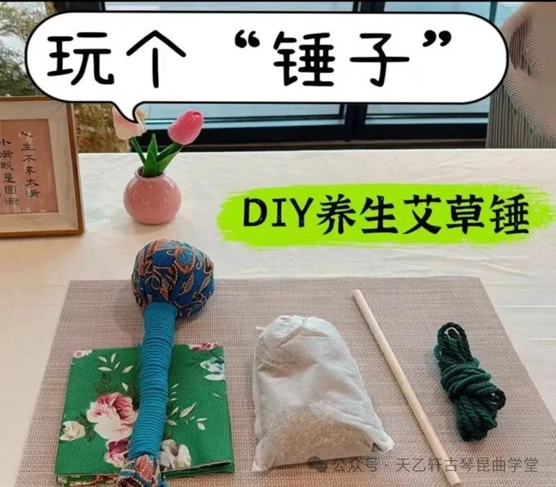 2. 手作教学:在老师指导下,将艾绒与棉布包裹成锤,用木柄固定,最后用彩绳缠绕装饰,制作成属于自己的养生艾草锤。