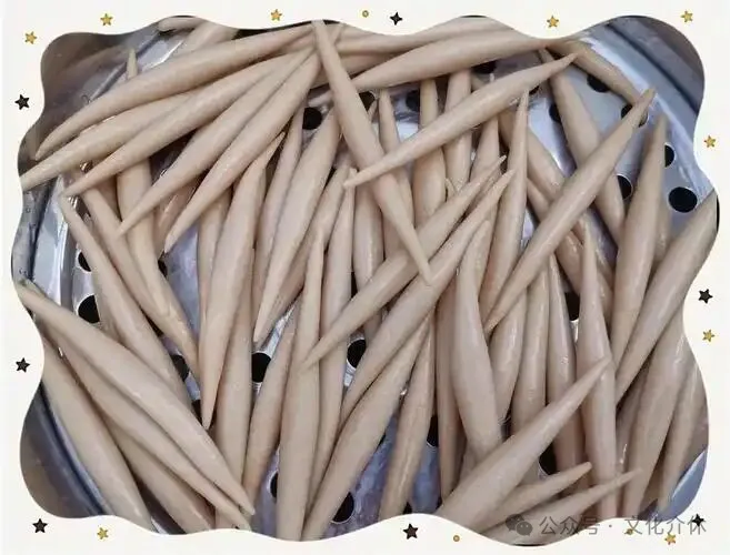 介休的乡音“牵”读“qie”。这种饭食其实和“搓鱼鱼”是姐妹。“搓鱼鱼”是长些的圆条,“圪牵牵”是短些的扁条(也有长条的);“搓鱼鱼”是煮,“圪牵牵”是蒸。蒸熟后舀到碗里,浇上“蘸水水”吃,也能配上酸菜炒土豆丝吃,与“搓鱼鱼”的口感不同,就这么一变,人的食欲就分外增加了。介休东山和南山农村上学的孩儿们一回家,母亲问想吃什么,张嘴就说:“圪牵牵”,孩子坐在灶前拉风箱,帮助母亲一起做,吃时眉开眼笑。