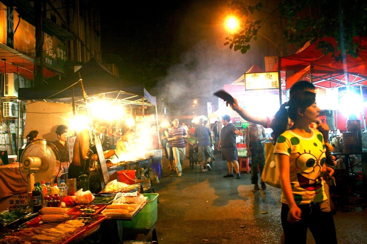 “早尝户部巷,夜吃吉庆街”吉庆街夜市大排档宽十几米,路面凸凹不平,白天冷冷清清,一到晚上,它的魅力便凸现出来。