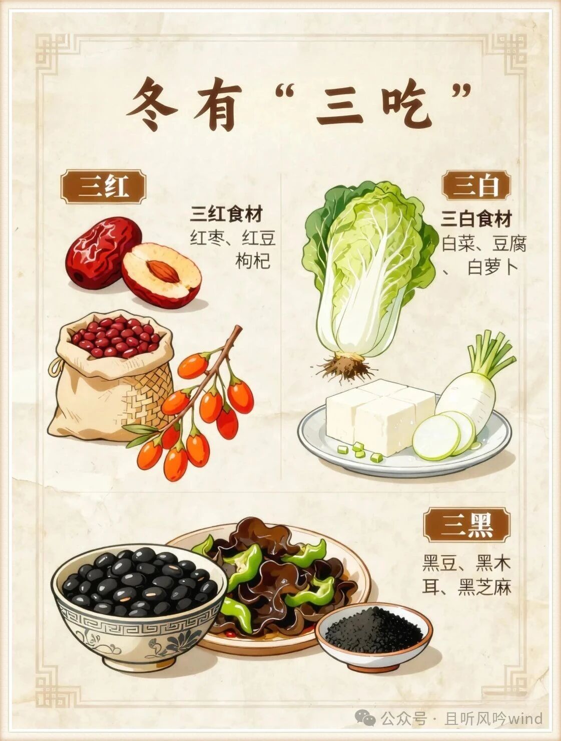 三红:红枣、红薯、红豆,补气养血 三白:白菜、白萝卜、山药,润燥清热 三黑:黑豆、黑芝麻、黑木耳,补肾强身