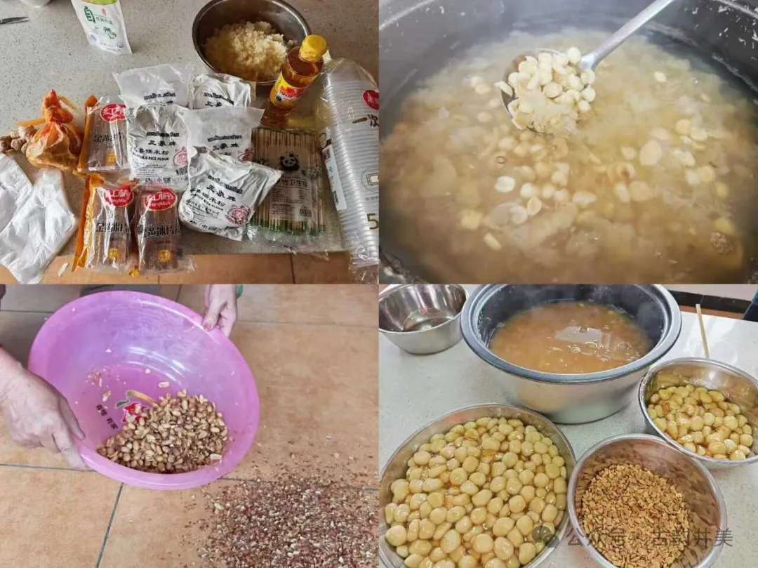 制作环节开始,现场分为两组同步进行。糖不甩小组分工协作,搓糯米粉、熔红糖、碾花生碎、整理餐具,在社工指导下,将糯米丸放入糖浆煮熟,撒上花生碎,香甜软糯的糖不甩顺利完成。糖水小组则将雪耳撕朵,淘洗莲子、百合,入锅大火烧开后转中小火慢炖25分钟,加片糖焖煮2分钟,一碗碗温润清甜的糖水新鲜出炉。