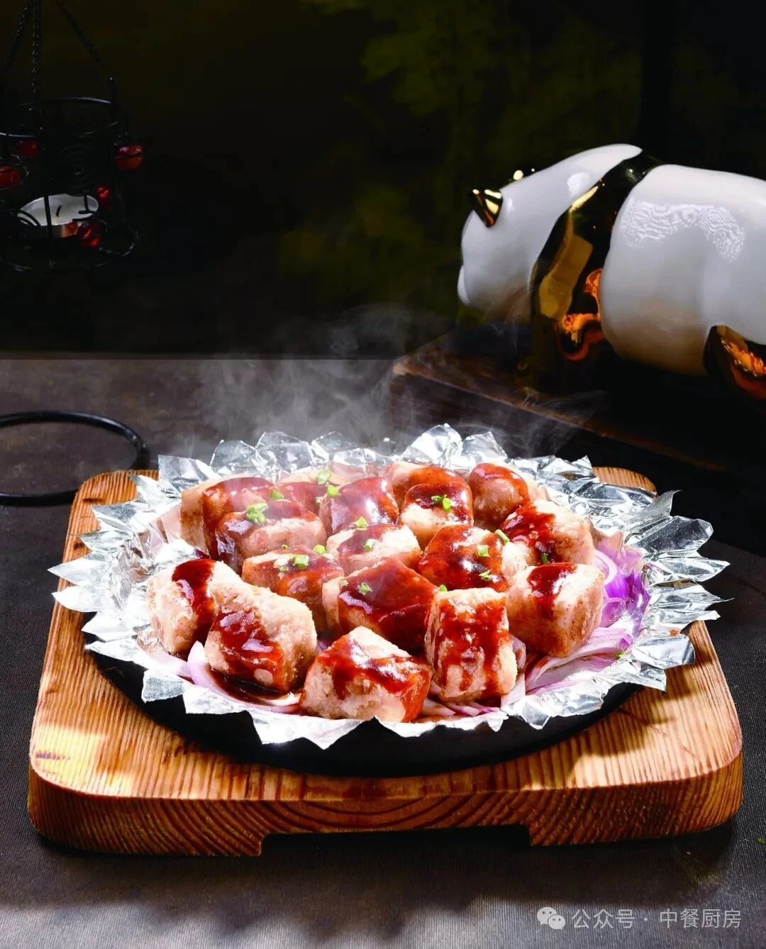 2.把铁板烧烫,放入黄油和洋葱丝,再摆制作好的香芋块,淋入料汁,撒上葱花即可上桌。