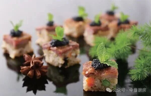 6.走菜时,将鸭方下入热油锅炸至外酥内糯,捞出沥油装盘,并在每块鸭方上面舀上黑鱼子酱,用鲜薄荷叶等点缀即成。