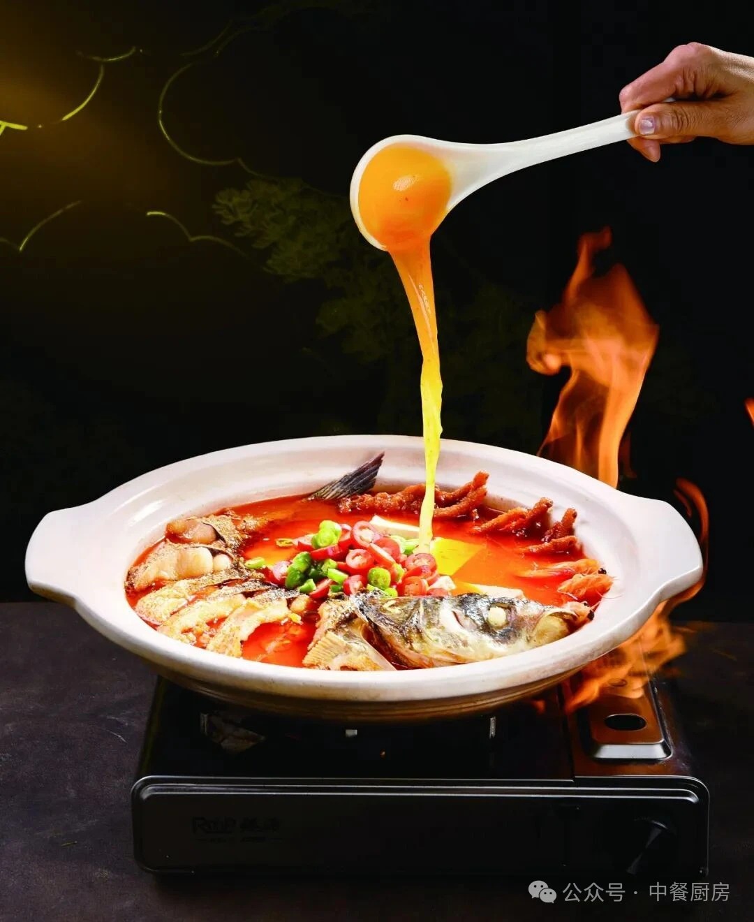 2.锅中放菜籽油、猪油烧热,加入蒜蓉辣椒酱和酸汤酱炒香,掺入鲜汤,烧开后下入炸好的鱼、虎皮鸡爪、基围虾和豆腐烧6 分钟,调入盐、鸡精、味精、白糖、胡椒粉,加入青椒圈和红椒圈,起锅装入烧烫的煲仔里即成。