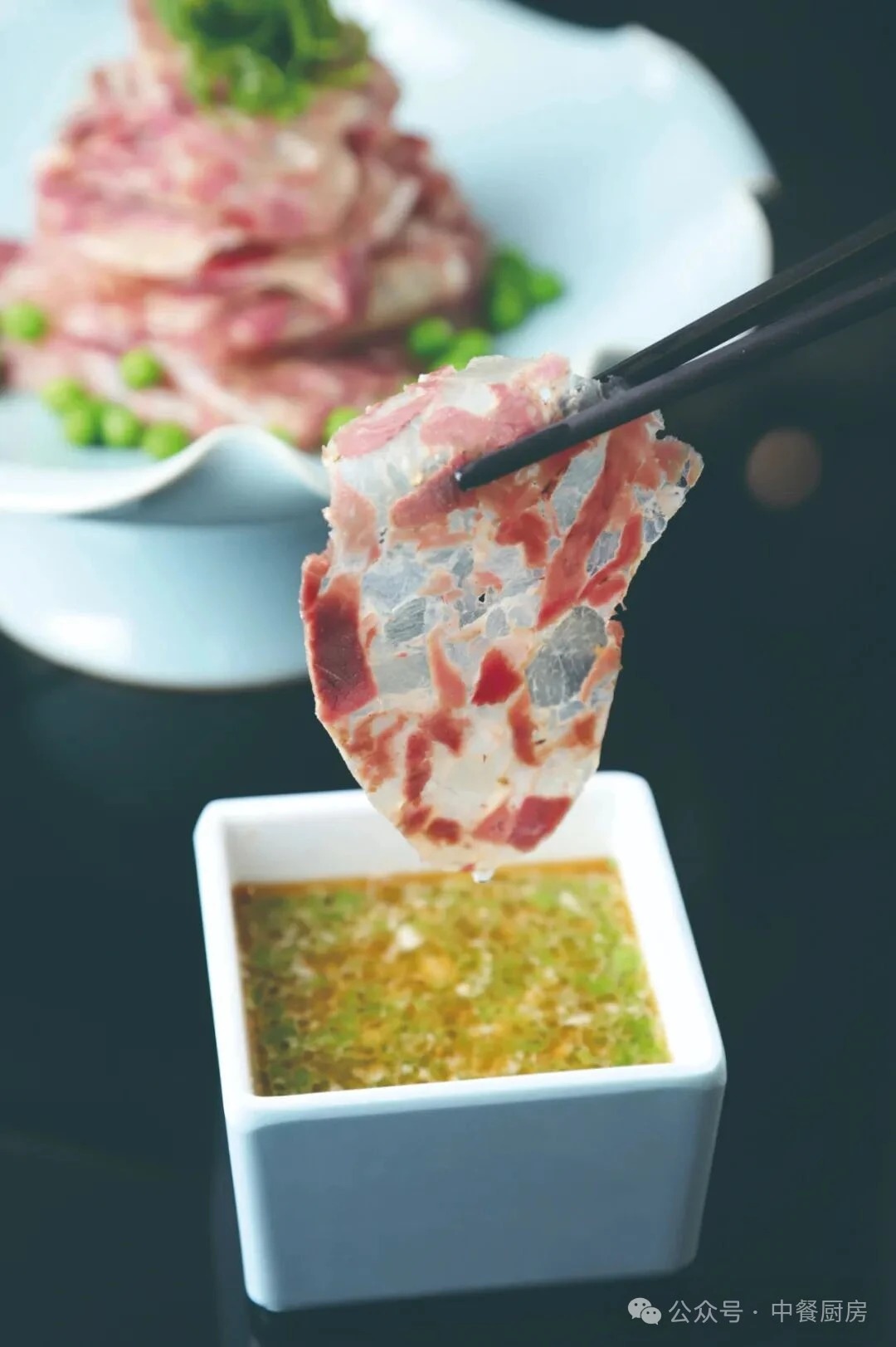 2. 取水晶状的羊肉和羊蹄筋切成大薄片,摆盘后随用青椒末、蒜泥、盐、味精、鸡汁、白糖、香油调匀的味汁蘸食。