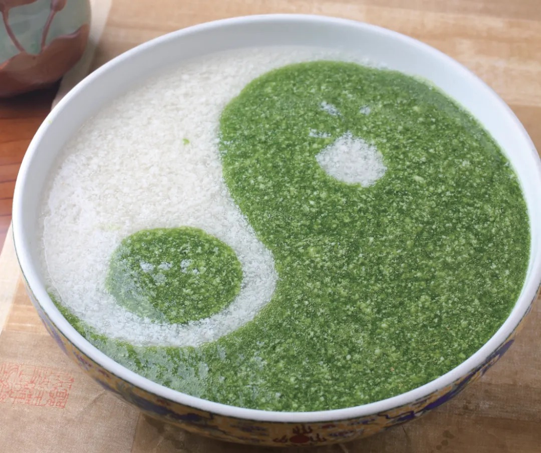 3.把白色和绿色鱼羹同时缓缓倒入大碗内,制成太极形状,即成。