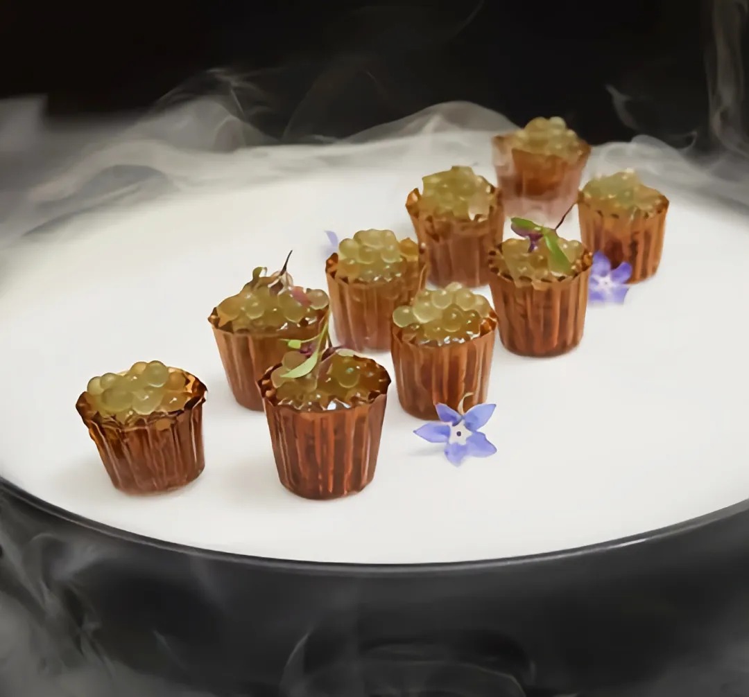 盐0.5克、胡椒粉0.2克、蒸鲜豉油100克、米醋300克、糖300克、卡拉胶45克、琼脂5克