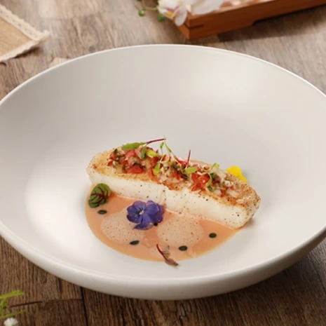 4. 鳕鱼装入盘中,倒入番茄泡沫和番茄汤汁,鱼上放入番茄沙沙,装饰花草即可。