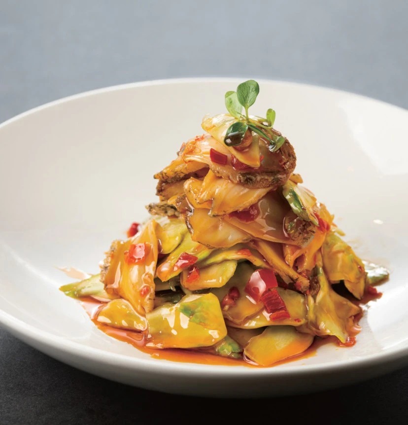 4.螺片沥干水分,拌入酱汁,撒入红柚子肉略拌,刨些青柠檬皮屑;