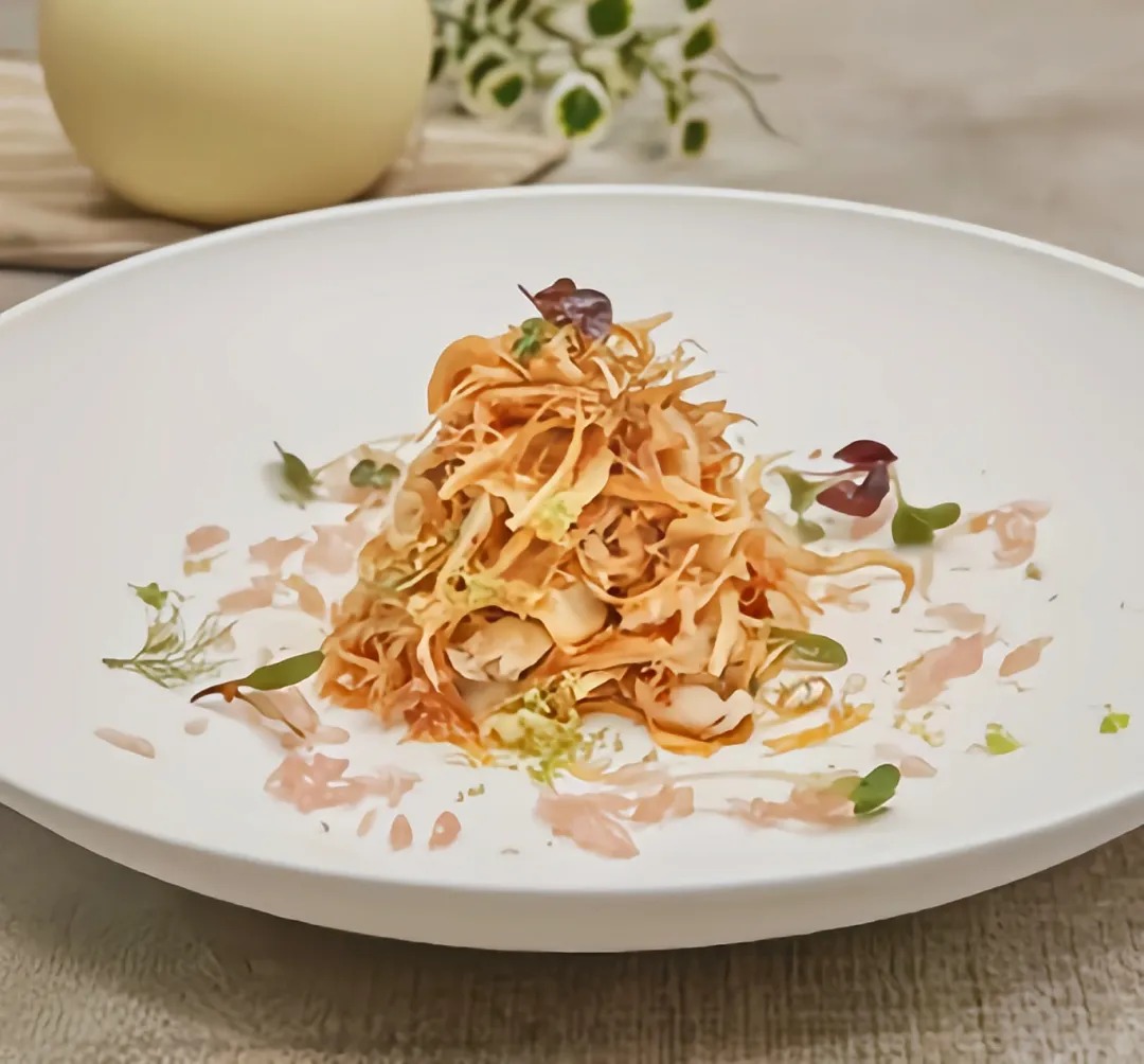 5.炸牛蒡丝、拌螺片、生菜苗捞拌均匀装盘即可。