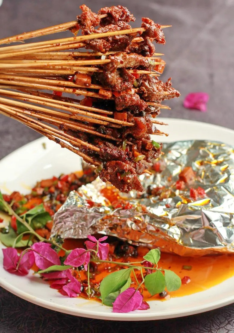 3. 净锅入油上火, 下入青红椒颗、洋葱粒、老干妈辣椒酱、孜然粉、鸡精、葱花炒匀,起锅淋在牛肉串上,再将牛肉串装入铝箔纸中,上桌后倒入适量高度白酒点燃,待火熄灭即可食用。