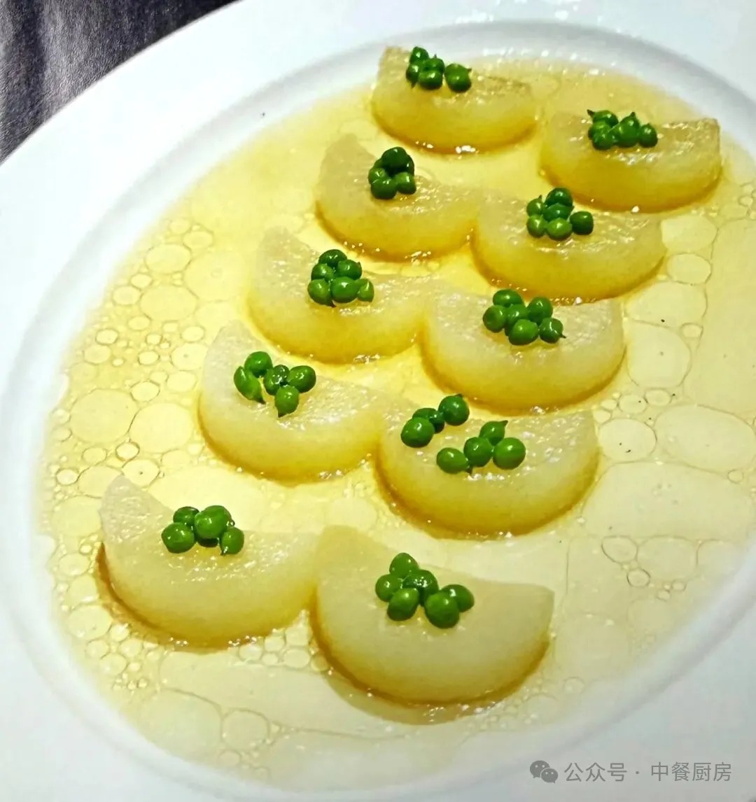 1、将冬瓜洗净,去皮、瓤,改刀成块,入蒸箱蒸10至12分钟至熟,取出放入糟汁中泡约2小时,捞出装盘,点缀焯熟的小甜豆,淋原汁即可。