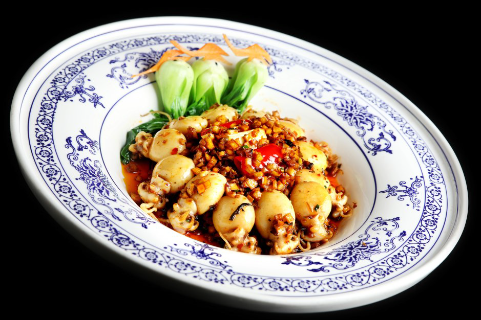 2.锅内倒入红油,放五花肉粒爆香出油汁,下姜米、蒜米、泡椒节、大葱节炒出香味,再加泡椒末、豆瓣炒至酥散水分干,倒入汆过的墨鱼仔炒入味。加入炸干的杏鲍菇粒、香菇粒、冬笋粒和外婆菜,烹入自制复合味汁、藤椒油、香油炒匀,起锅装盘,摆上汆熟的青菜即可。