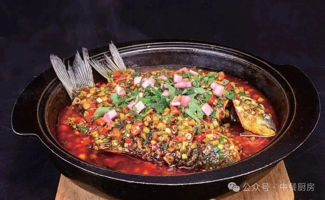 2.锅入化猪油、菜油加热至四成热,放蒜米、豆瓣、泡椒末炒至颜色红亮、香味溢出时,下泡豇豆节、泡子姜米、泡青菜头碎、泡小米椒节炒出香味,掺入鲜汤,调入味精、鸡精、白糖、香醋,再放鱼眼葱白、米酒,把鱼放入锅中小火软烧。入味后放入藿香末烧至断生,勾二流芡。