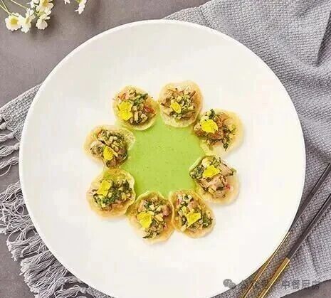 7. 蚕豆汤淋入盘中留空处即可。