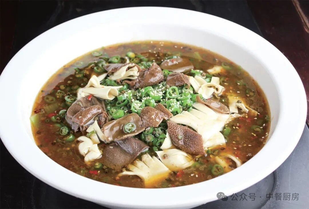2.净锅烧热,下入青椒酱炒香出味,掺适量清水烧沸,调入椒麻鸡汁、辣鲜露、盐、味精、鸡精,放入汆过水的黄喉片、毛肚片煮入味,用水淀粉勾薄芡,出锅装入垫有青笋片的盆里。