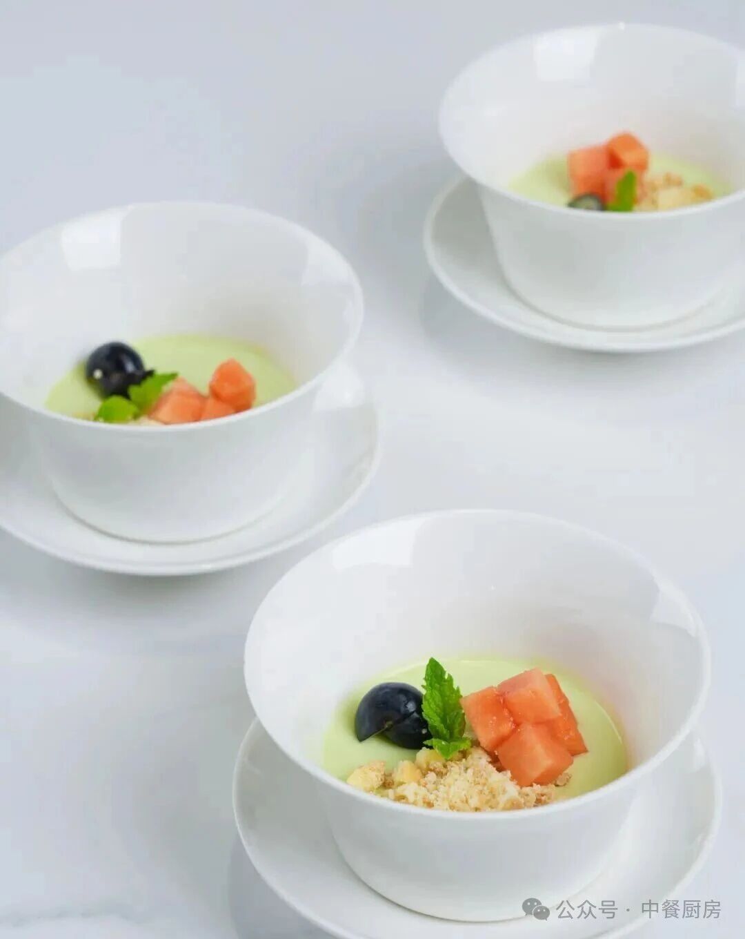 3.走菜时取出凝固好的慕斯,点缀水果丁、饼干碎、薄荷叶即可。