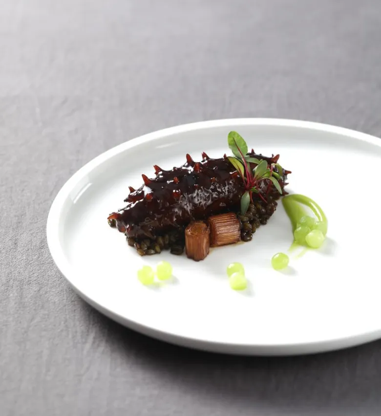 2.将青麦仁煮熟,用海参汁、高汤调味备用;