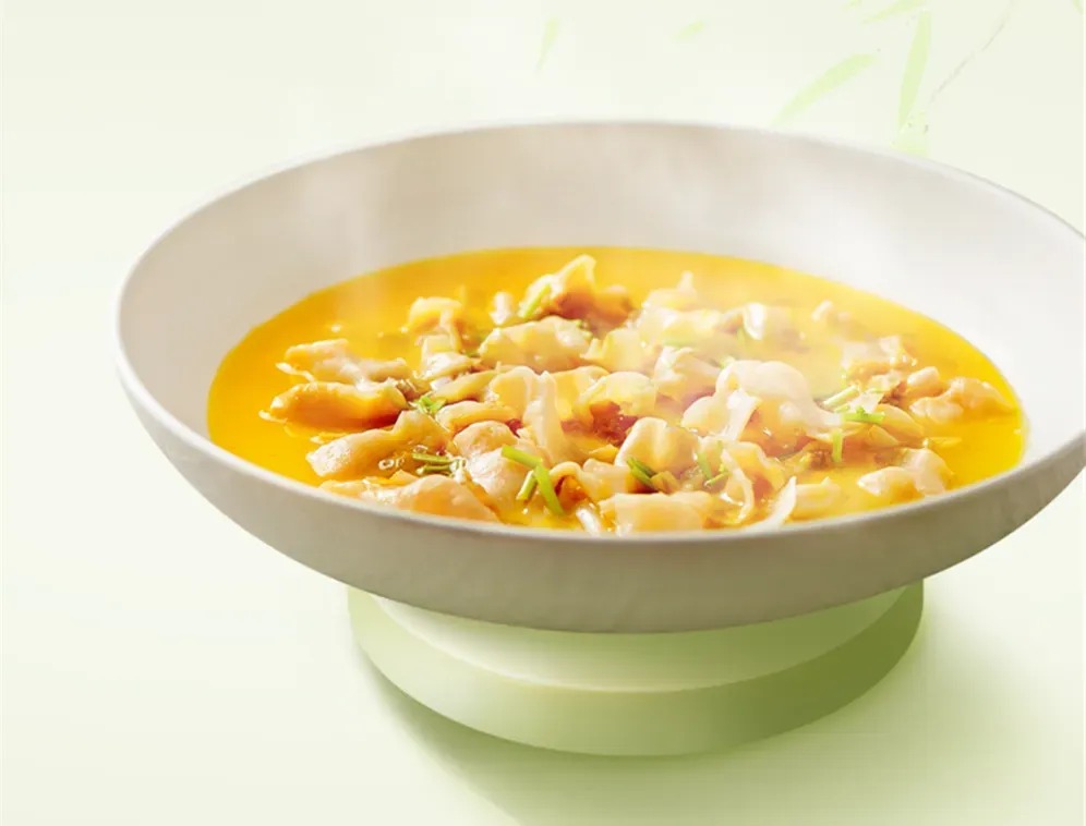 5、根据个人口味加入适量的盐、鸡粉和白胡椒粉调味,继续煮1-2分钟关火,盛出黄辣椒酸汤海螺片装盘(用筷子夹海螺片在上面),撒上香菜梗或葱花作为装饰后,即可