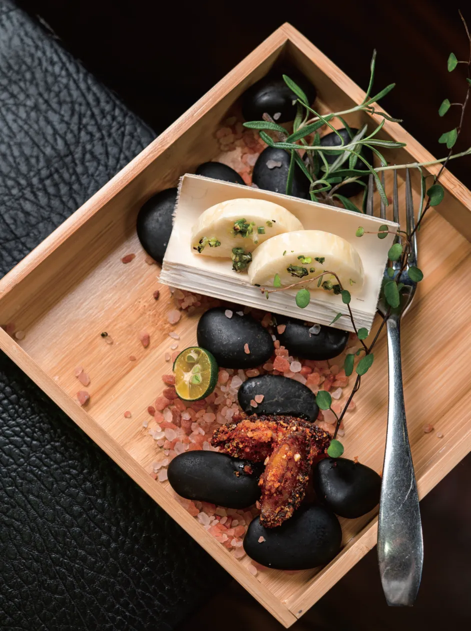 4.鹅卵石烤烫后摆入盘中垫底,一侧摆上烤好的棕榈芯,另一侧摆上怪味鲍鱼,以迷迭香、红玫瑰海盐、小青桔等点缀即可。