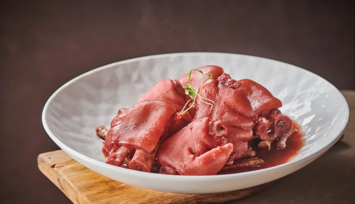 3、将腌制的猪手放在香藤根上蒸35分钟即可。