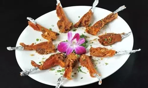 掌中宝200克,用蔬菜汁浸泡30分钟以上,祛除异味后捞出控水,加入蒜香粉10克,脆炸粉15克,玫瑰露酒、料酒各5克,盐、味精、鸡粉各3克,白糖2克抓拌均匀,腌制15分钟。