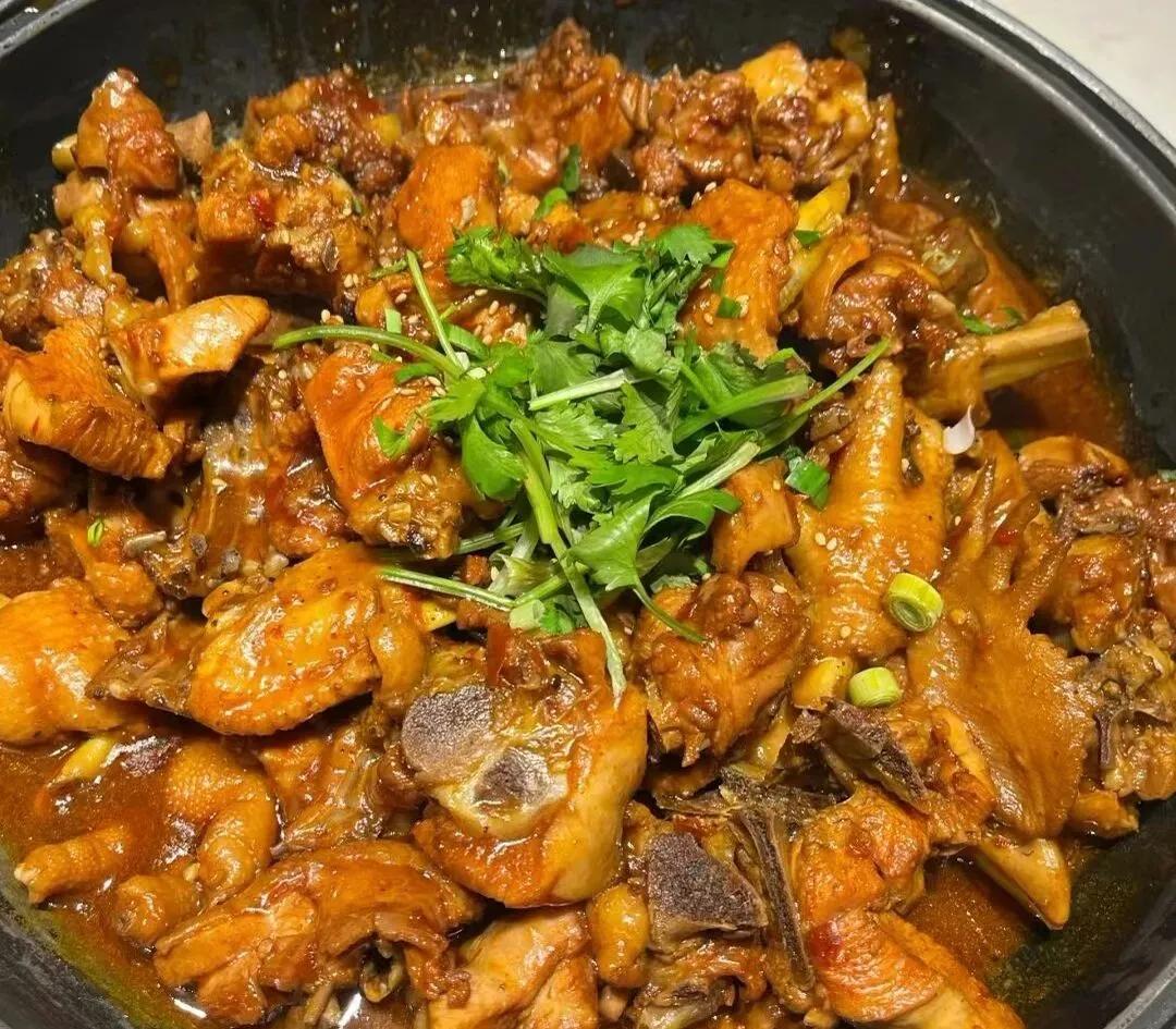 (3)净锅置中火上,放色拉油和化猪油烧至六成热时,下入鸡块煸炒5分钟,下盐、郫县豆瓣酱、花椒、糍粑辣椒、炒至油呈红色时,下姜米、蒜米、白糖、胡椒粉、味精炒制2分种,加入鲜汤500克,下各种滋补药材及香料(浸水沥干)烧开,高压锅中压8分钟出锅,加入冬笋片、香菇块烧3分钟,装入盆中,撒香菜即可上桌。吃完后可烫各种素菜。