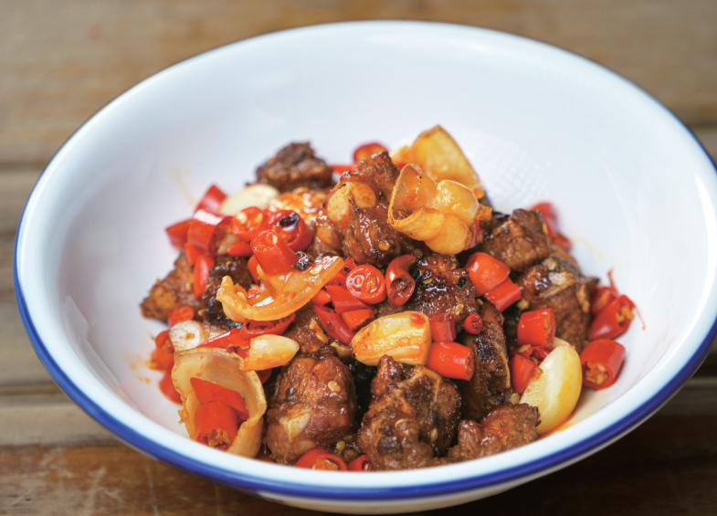 2.净锅入菜籽油烧热,下入姜片、蒜瓣、花椒、前夹肉片煸炒至干香出油,放入码好的排骨节,煸炒出香味,调入干锅酱、自制酱料、盐、料酒、鸡精、味精、白糖炒入味,下美人椒、小米椒、葱节颠匀炒断生,淋些香油,出锅装碗即成。