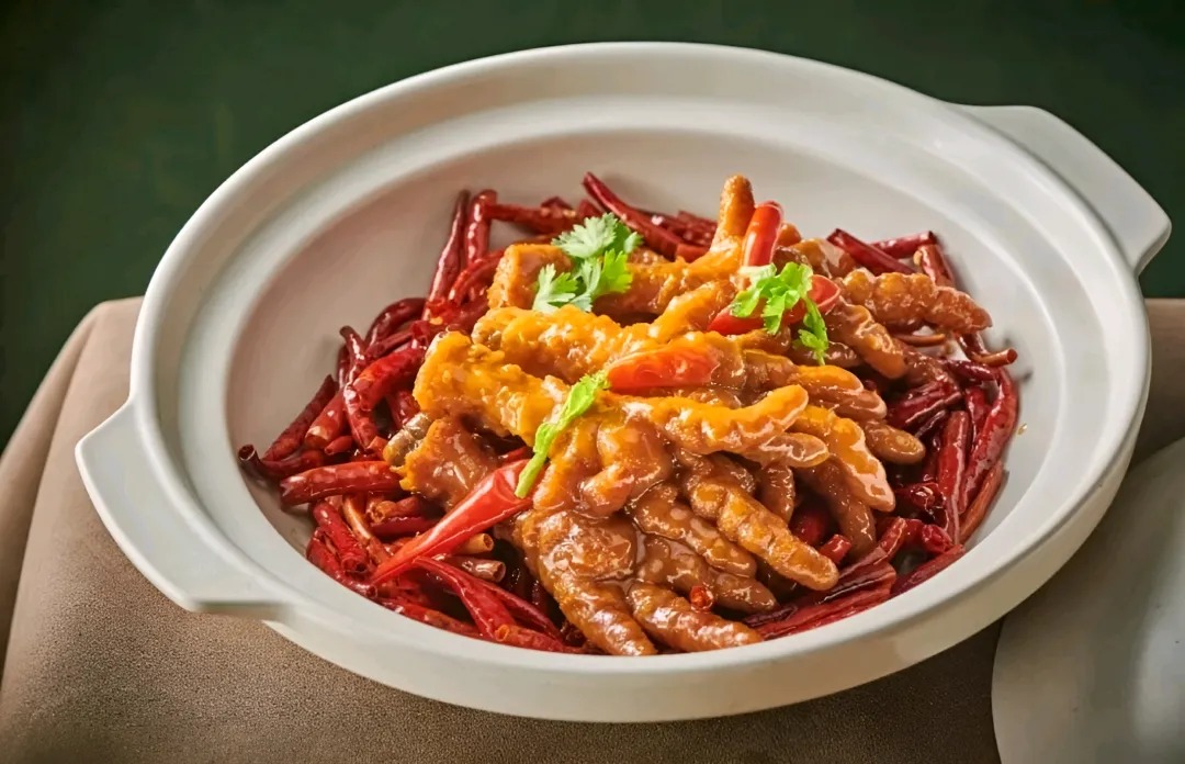 3、将制作好的虎皮凤爪放入调好的鲍汁中,确保凤爪被鲍汁完全覆盖小火慢煲约30分钟,让凤爪充分吸收鲍汁的鲜美和辣味,同时保持其虎皮的香脆。将入味后的虎皮凤爪捞出,摆放在盘中,注意保持其形状和虎皮的美观。