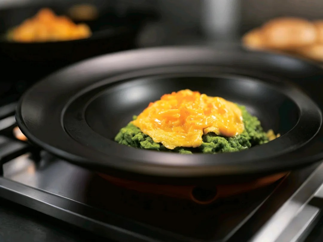 3、将鸡蛋液打散,搅拌均匀。平底煎锅加热,倒入打散的鸡蛋液。使用筷子夹住鸡蛋液的两侧,轻轻转圈,使鸡蛋液在锅中均匀受热。待鸡蛋液刚凝固但内部仍略带流动感时,用锅盖迅速盖在鸡蛋上,利用锅内的余温使鸡蛋完全熟透,同时保持其嫩滑的口感。将制作好的滑蛋轻轻盖在蚕豆泥上,使其与蚕豆泥紧密结合。最后,撒上鱼子酱作为点缀,增加口感和视觉效果。