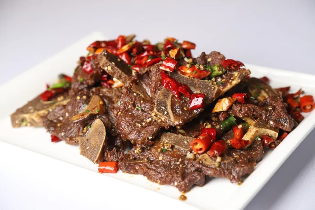 2.锅留底油,投入干辣椒节、干花椒、二荆条辣椒节和红美人椒节爆香,放入炸酥的牛脊骨块,调入鸡精、味精、白糖、美极鲜酱油和红油炒香入味,淋上花椒油和香油,撒孜然粉和白芝麻颠匀,出锅装盆即成。