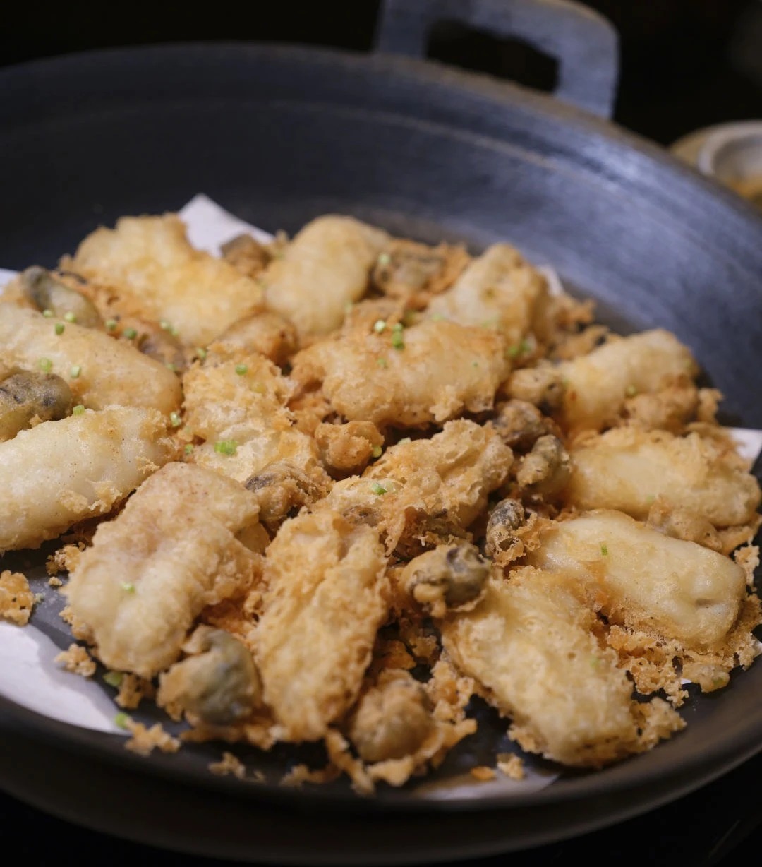 2、蛎皇过水挑干净,吸水,放底味,加包装的天妇罗粉和天妇罗酱炸好待用