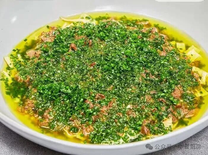 4、锅烧热油爆香葱花浇淋牛肉上即可。
