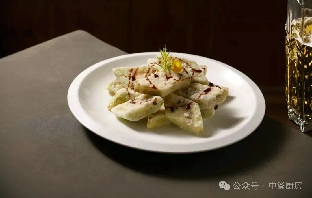 3、将炸好的茄子块整齐摆入盘中,取出冷藏的冰川汁,均匀淋在茄子表面(每块茄子都需覆盖汤汁,确保入味) 最后用食用花草在盘边或茄子表面点缀,即可出品