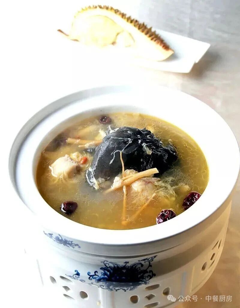 乌骨鸡1只(重约1200克) 榴莲肉400克当归段10克姜片、葱结、盐、料酒、葱段、红枣、枸杞各适量