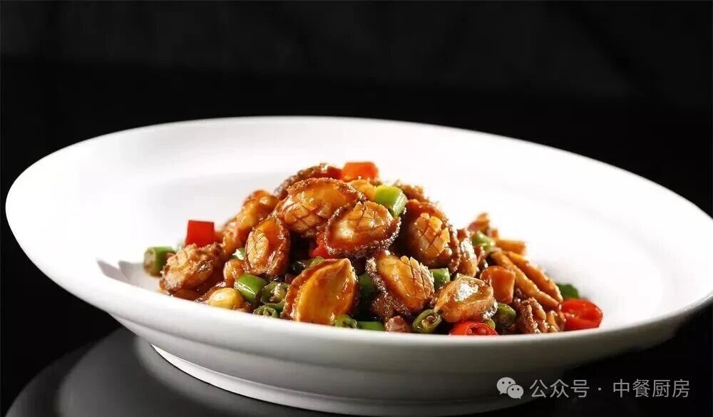 1.把仔公鸡肉斩成小块,用盐、姜葱汁和料酒腌味,再投入热油锅炸至表面金黄酥脆时,捞出来沥油。另把鲜鲍鱼肉治净,剞十字花刀,用盐、姜葱汁和料酒腌味,再投入热油锅炸熟,捞出来沥油。