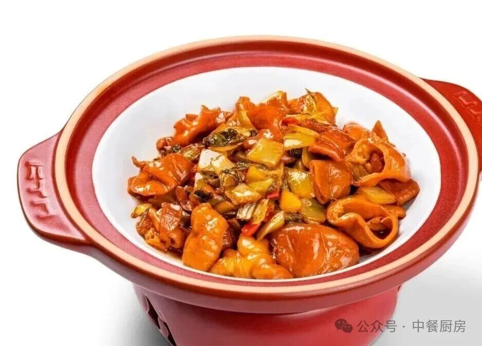 3. 净锅烧热,加入色拉油,下洋葱片、香菜节、大蒜炒香,掺入高汤,加入黄灯笼辣椒酱、野山椒末、鸡汁、鸡精、白醋,再放入金瓜汁上色,小火熬制5 分钟,打去料渣,然后倒入煲好的猪蹄块、裙边、脆笋片、金针菇煮2 分钟,起锅装盘。
