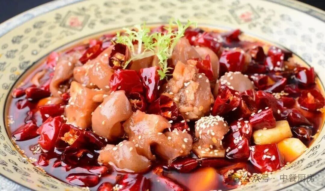 7.将炒制好的巴蜀麻辣牛三宝盛出装盘,撒上一些葱花或香菜作为点缀即可