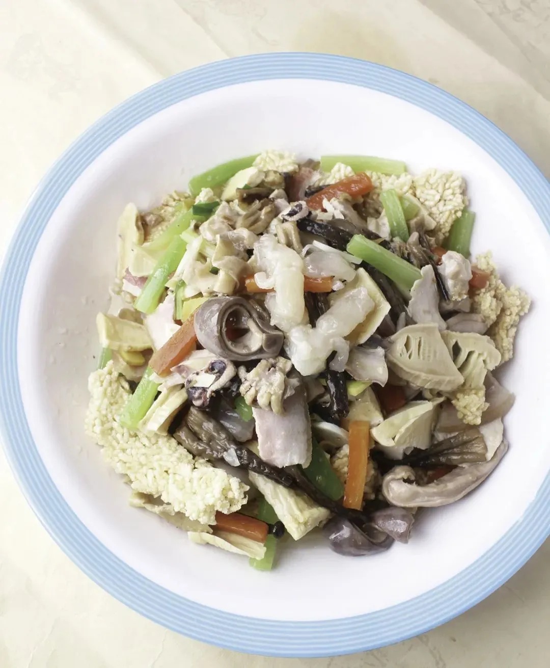 1.把墨鱼放火上烤软,洗净后用冷水泡发一夜,切成条。鲜猪蹄筋用开水泡发两天,从中间切成两半。猪肚洗净,汆水并切成条。火腿、鸡肉放鲜汤锅煮熟,捞出来分别切片。鹿茸菌用冷水浸泡1.5小时,淘洗干净,入沸水锅焯水,捞出来挤干多余水分。笋子片、青笋条、广红萝卜条下沸水锅汆水,捞出来沥水。