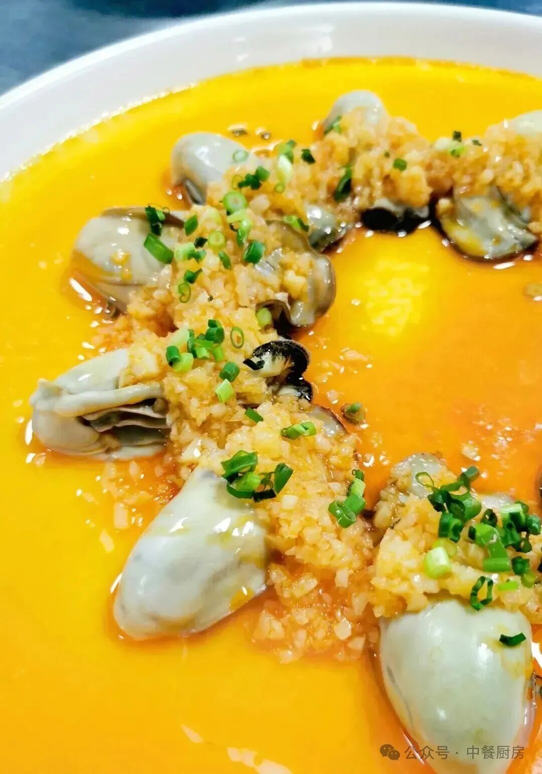 3、生蚝肉摆在蒸好的蛋羹上,浇上蒜蓉酱蒸透撒少许香葱末点缀即可。