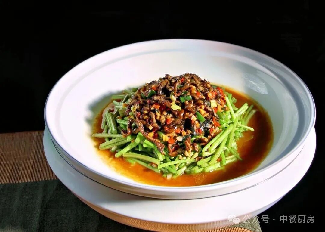 4、将炒好的藜蒿放入器皿内,再把炒好的鳝鱼放入在藜蒿上,即可。