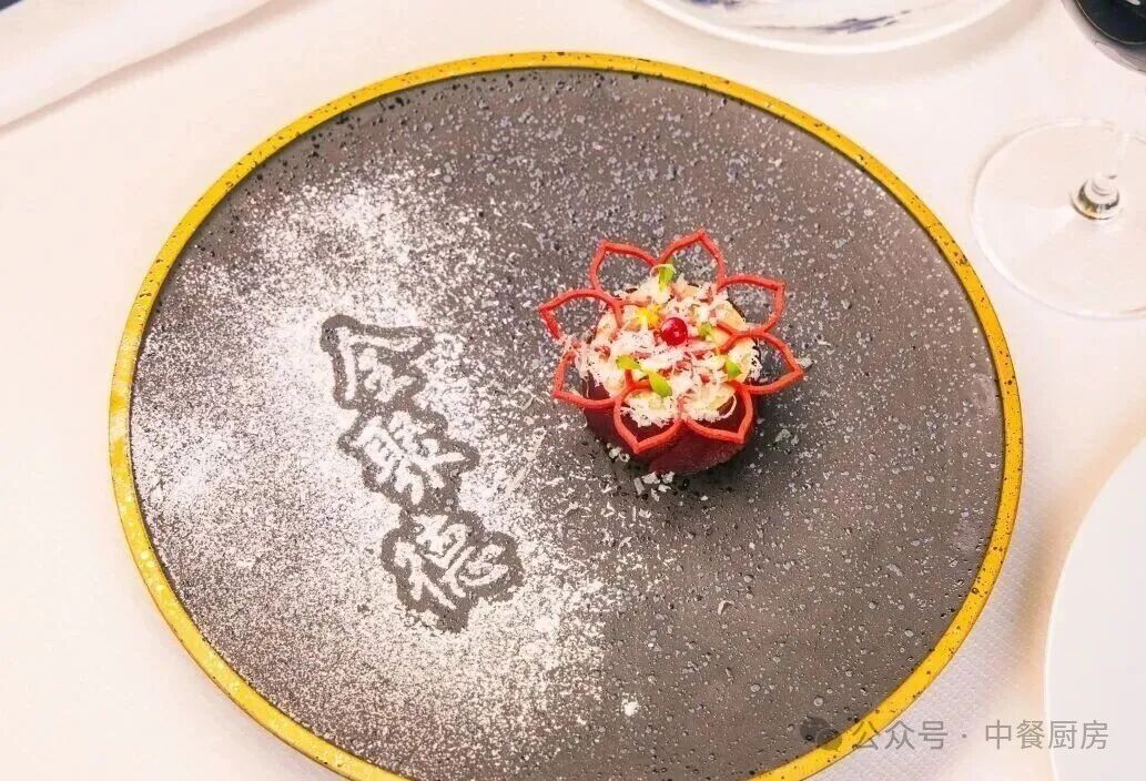 1.加工鹅肝:法国鹅肝600克入牛奶浸泡24小时去腥,放在牛奶中入蒸箱蒸20分钟,取出浸入红酒汁(安哥拉红糖水100克、清酒30克、浓缩黑加仑汁100克、味淋30克、红酒800克调匀)冷藏浸泡12小时,取出去掉筋膜打成泥后过筛,装入裱花袋内稍微冷冻一下定型。